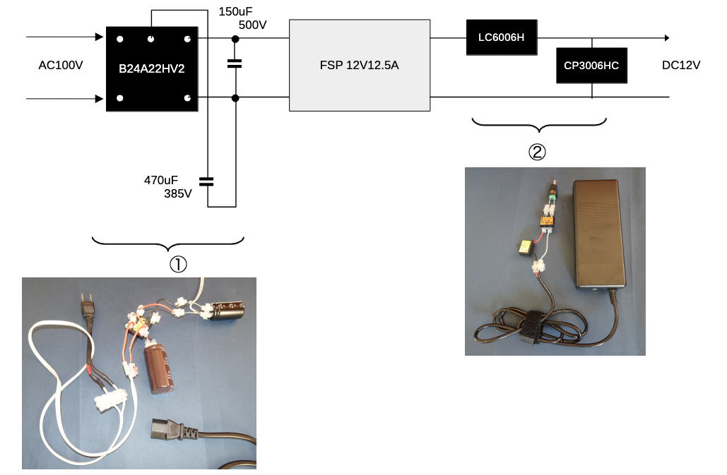 コンセントとFSPの間に①第二世代整流回路を入れて、FSPの出口には②LCMとCPMを入れているが、いずれにしても簡単な回路である。